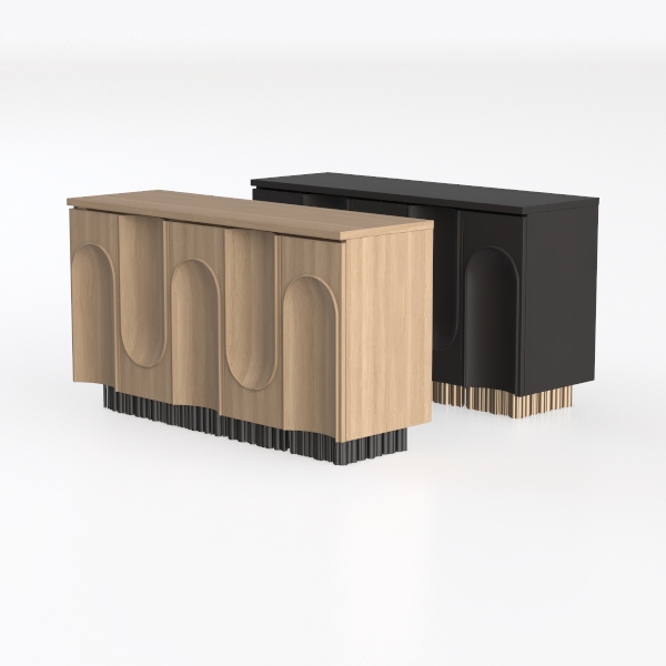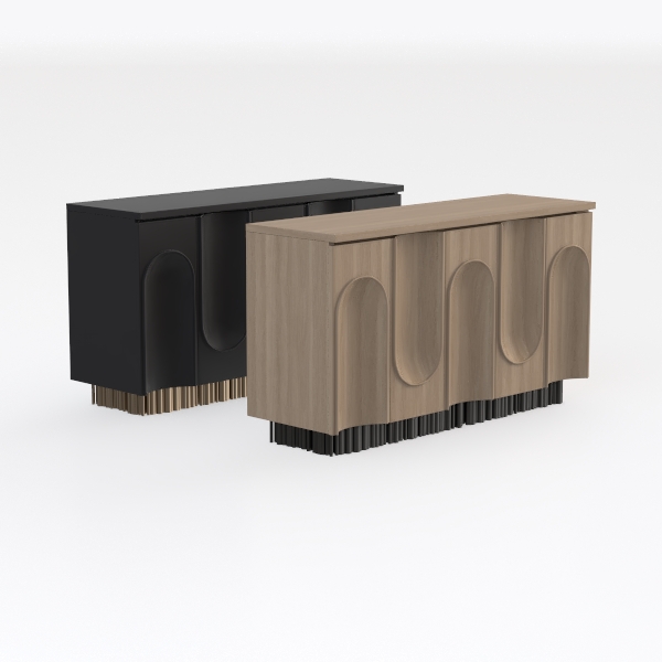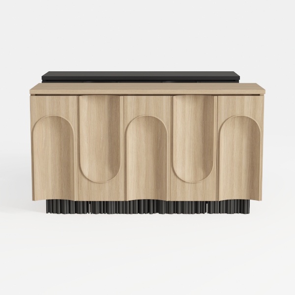 Crafted with organic curves inspired by natural landscapes, this piece blends warm oak wood grains with sleek black countertops. Subtle vertical folds at the base add textural depth, while curved doors reveal ample storage space. Ideal for modern minimalist or mid-century modern living/dining, pairs beautifully with marble accents and soft lighting—style meets practicality seamlessly.
