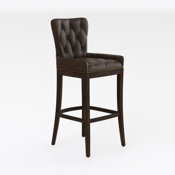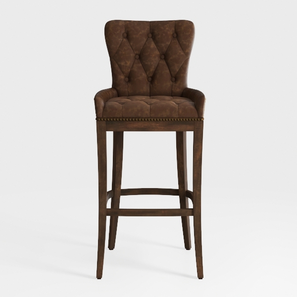Drawing inspiration from timeless vintage aesthetics, this high stool blends classic charm with modern practicality. Its rich brown leather upholstery features intricate button tufting, offering a soft, luxurious touch and textured visual appeal, while warm wood legs with subtle grain add stability. Ideal for a modern rustic kitchen island or elegant dining nook, it pairs beautifully with marble countertops or wooden tables, enhancing any space with refined elegance.