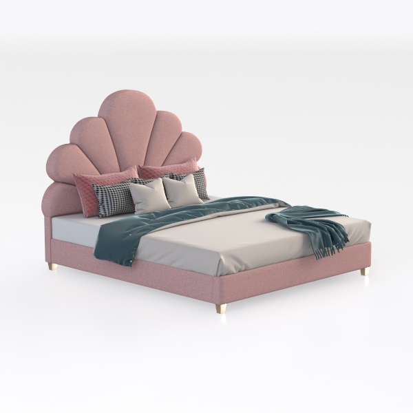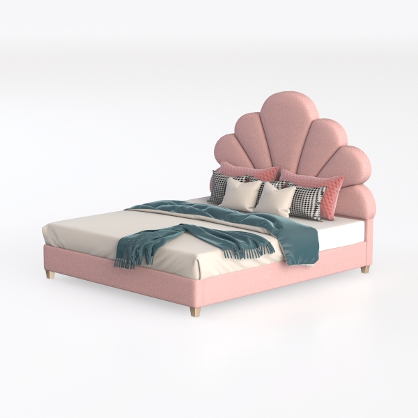Inspired by natural floral forms, this bed features soft, plush pink upholstery that complements crisp white linens and a teal throw. The curved headboard offers gentle support, enhancing relaxation, making it ideal for a modern, romantic bedroom paired with marble nightstands and dainty pendant lights.
