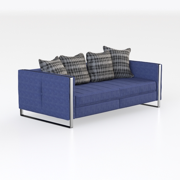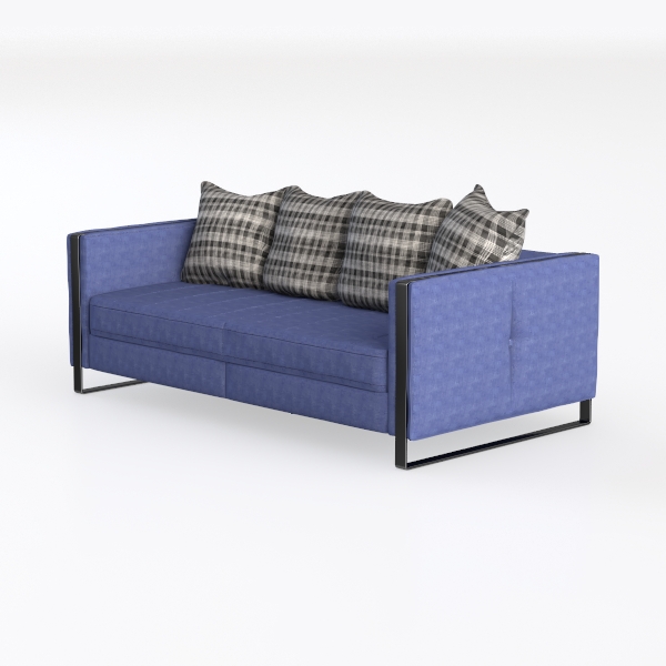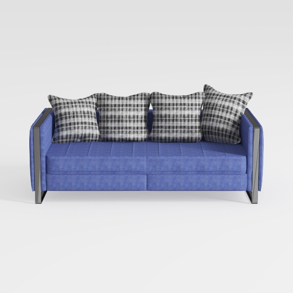 Crafted with a sumptuously textured upholstery in a deep, muted blue, the surface offers a tactile experience—plush yet with a subtle weave that catches light gently, enhancing its rich hue. The angular, matte metal armrests and legs add a contemporary edge, their clean lines framing the sofa without overwhelming its softness, while the overall low profile keeps the design light and airy.