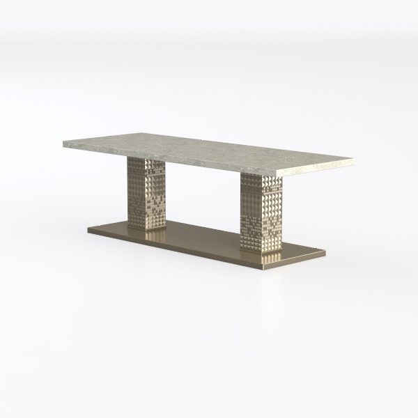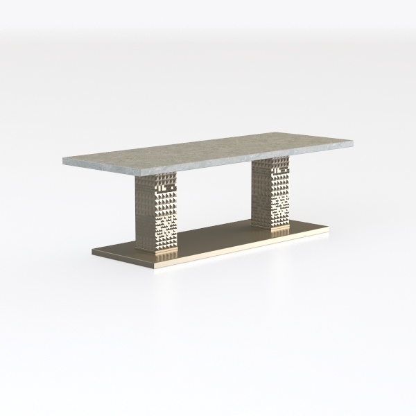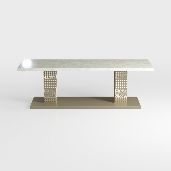 Inspired by classical architectural elements, blending vintage column designs with modern simplicity. The smooth, veined marble top feels cool and elegant, while the geometric-patterned metallic legs add intricate texture and subtle shine, creating a balanced, sophisticated look. Ideal for a modern-luxe living room console or dining area, pairing with sleek sofas or wooden chairs and neutral decor. Wide surface offers ample space for essentials, with sturdy legs ensuring stability and lasting use.