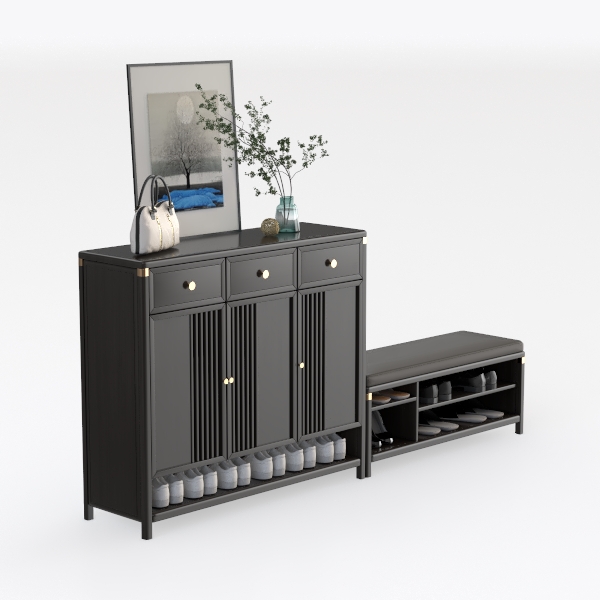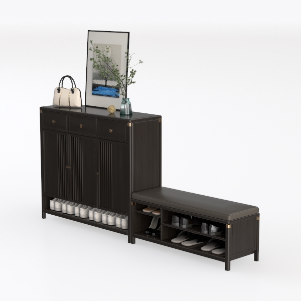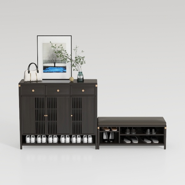 Blending traditional slatted elements with modern minimalism, this entryway set draws inspiration from classic Asian furniture, balancing elegance and simplicity. Crafted from matte dark wood, its smooth surface offers a warm touch, while intricate slats add texture and depth. Ideal for entryways or corridors, it pairs with minimalist art, potted greenery, and metallic accents, enhancing a serene, refined vibe. Deep drawers, closed storage, and a lower shoe rack provide ample space, and the sturdy bench ensures comfort during shoe changes.