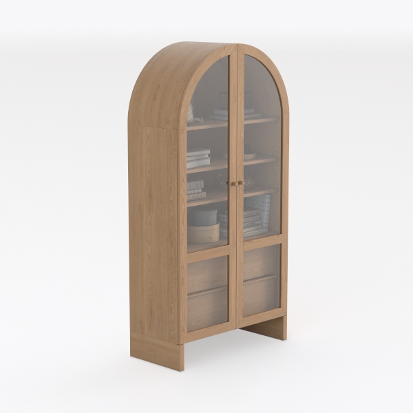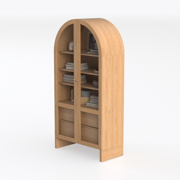 Inspired by mid-century craftsmanship, this wooden bookcase features an arched top and warm oak texture with smooth, polished surfaces. Clear glass doors enhance light diffusion, showcasing curated books and decor. Ideal for a cozy living room or study, blending Scandinavian minimalism with timeless charm. Spacious shelves and lower drawers offer both display and hidden storage, balancing aesthetics and functionality.