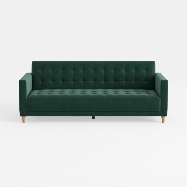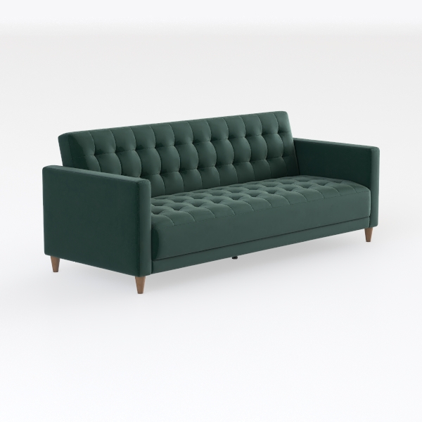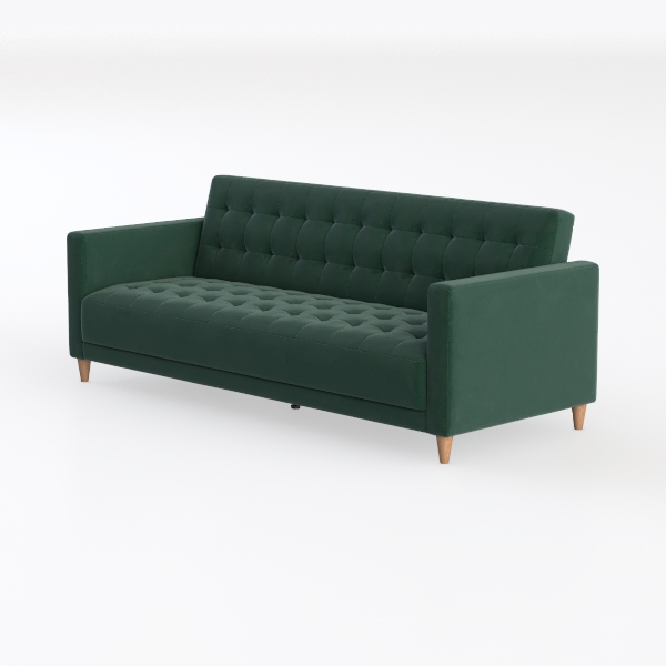 The star feature is its rich, deep emerald upholstery—a sumptuously soft, plush fabric that invites touch. Running your hand over it reveals a smooth, velvety texture, warm and inviting, while the fabric’s slight sheen catches light gently, enhancing the color’s depth. Subtle tufted buttons dot the back and seat, adding textural contrast without overwhelming the design, and the slim, tapered wooden legs lift the sofa, giving it a light, airy feel that contrasts beautifully with the plush upholstery.