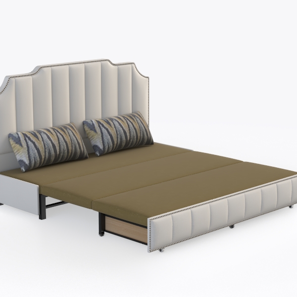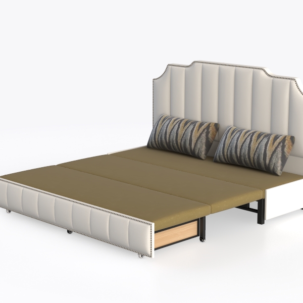 Ideal for a modern or minimalist bedroom, it pairs seamlessly with warm-toned wooden nightstands (with slim metal legs for a light, airy feel) and a marble-top dresser with geometric hardware. Floor-length linen curtains in soft cream or gray complement the bed’s neutral palette, while a pair of brass wall sconces casts a warm, diffused glow, enhancing the serene, sophisticated vibe.
