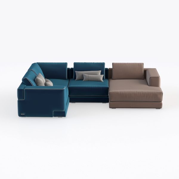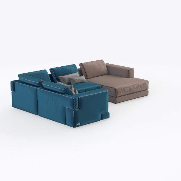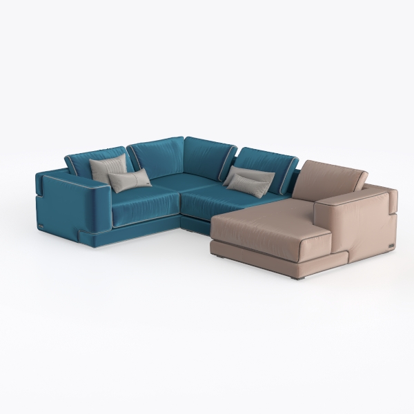 The fabric, soft to the touch like buttery velvet, wraps around the frame with a subtle sheen—deep teal blue on the main section, complemented by warm taupe on the chaise, creating a visual rhythm that feels grounded yet dynamic. The edges are gently rounded, adding a tactile softness, while the contrast in textures (velvety softness of the blue, smooth matte finish of the taupe) enhances depth, making the piece feel both modern and inviting.