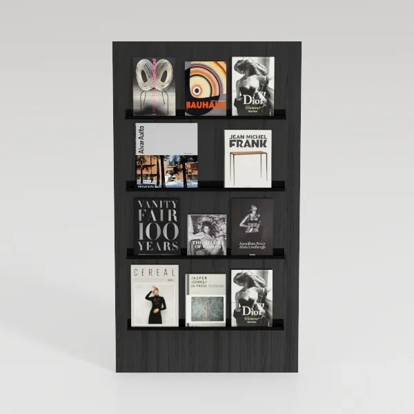 Designed to blend artistic heritage with modern minimalism, this dark wood bookshelf features a smooth, matte finish and clean lines. Its rich textures and curated book arrangement create a sophisticated focal point for modern living rooms or study spaces, complementing sleek sofas and metallic accents. Spacious shelves offer ample room for design books and decor, balancing storage with aesthetic allure.