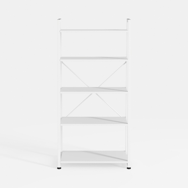 Inspired by minimalism, this shelving unit blends clean lines and functional storage. Sleek white shelves, paired with matte metal frames, create a light, airy feel—smooth to the touch, with subtle shadows enhancing its modern appeal. Perfect for modern, compact spaces like home offices or living rooms, it complements plants, books, and decorative items. Sturdy cross-braces ensure stability, while the open design keeps the room uncluttered, making it both practical and stylish.