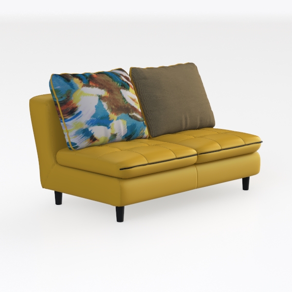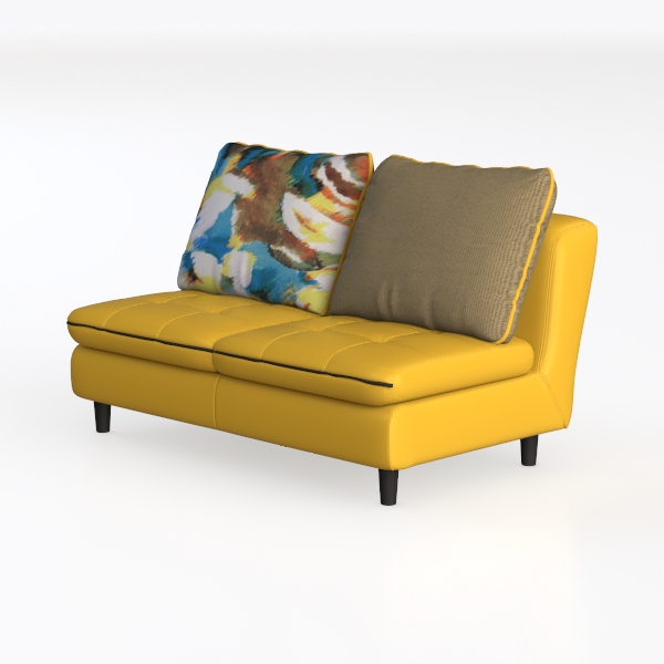 Visually striking yet tactilely inviting, the sofa’s smooth, slightly textured surface feels soft under the hand, while the deep, buttery yellow hue radiates warmth, catching light to create a cheerful glow. The contrast between the soft, earthy brown knit cushion (with its subtle weave pattern) and the vivid abstract one adds balanced visual depth, making it a focal point without overwhelming smaller rooms.