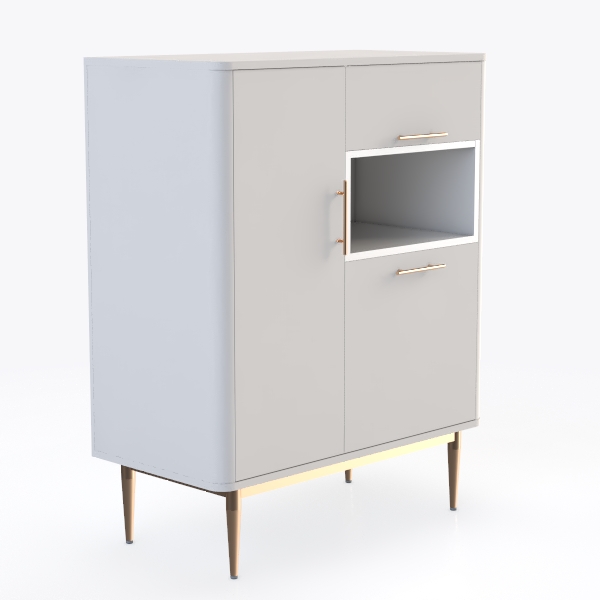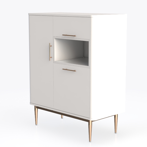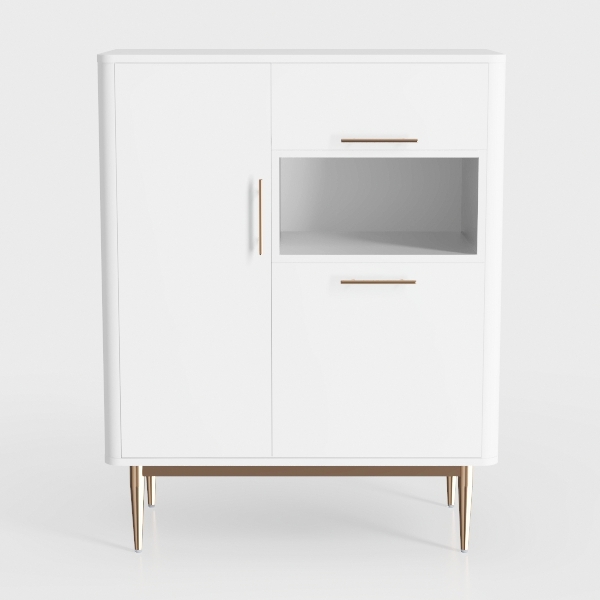 Inspired by mid-century modern minimalism, this cabinet boasts a sleek matte white finish, smooth to touch, radiating clean, timeless elegance. Gold metal handles and tapering legs add subtle vintage charm, with a closed storage section, drawer, and glass-fronted display area balancing functionality. Perfect for modern minimalist living or dining spaces, complementing marble and wood accents for a polished, sophisticated look.