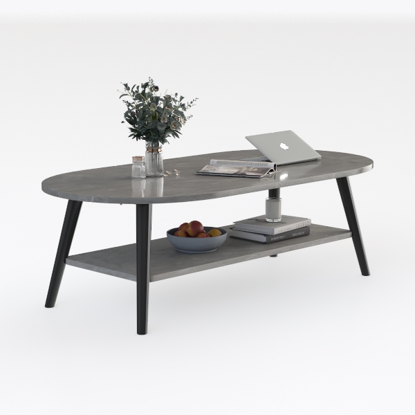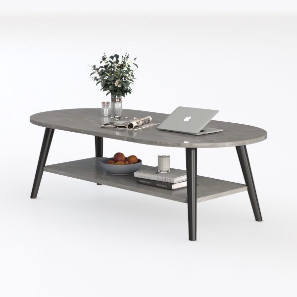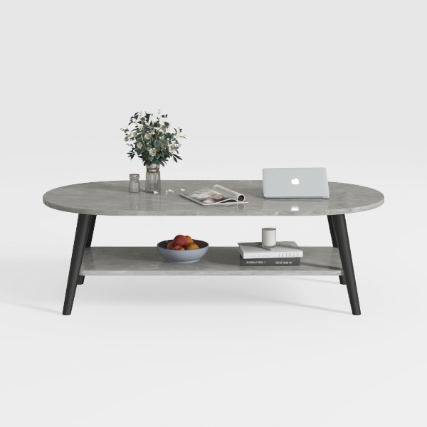 Drawing inspiration from natural stone’s organic patterns, this oval coffee table features a smooth, veined surface—cool and sophisticated to the touch—with sleek black legs for minimalist contrast. It creates a clean, airy focal point in modern-luxe living rooms, pairing well with soft sofas, metallic accents, and potted greenery. The lower open shelf adds handy storage for books or decor, blending style and practicality.
