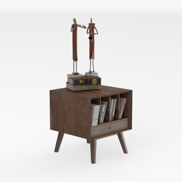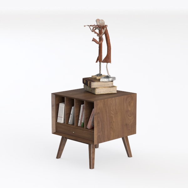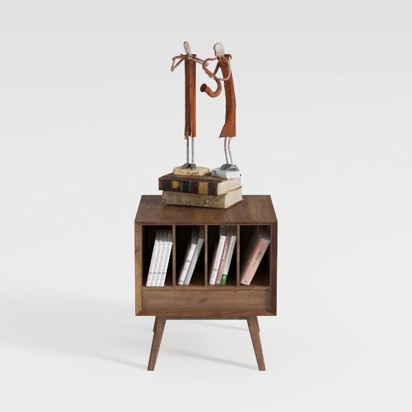 Inspired by mid-century modern design, this wooden side cabinet blends function with warm aesthetics. Its smooth, polished wood surface radiates natural warmth, while open compartments showcase books and decor, adding visual depth. Ideal for a cozy bedroom or minimalist living room, pair it with soft walls and simple lamps for an inviting vibe. A hidden drawer and slim, angled legs ensure stability, balancing practicality and style.