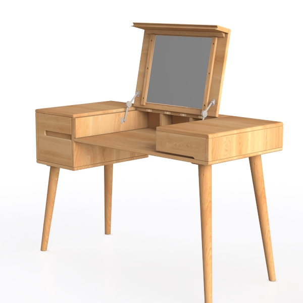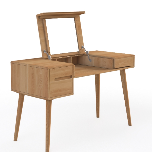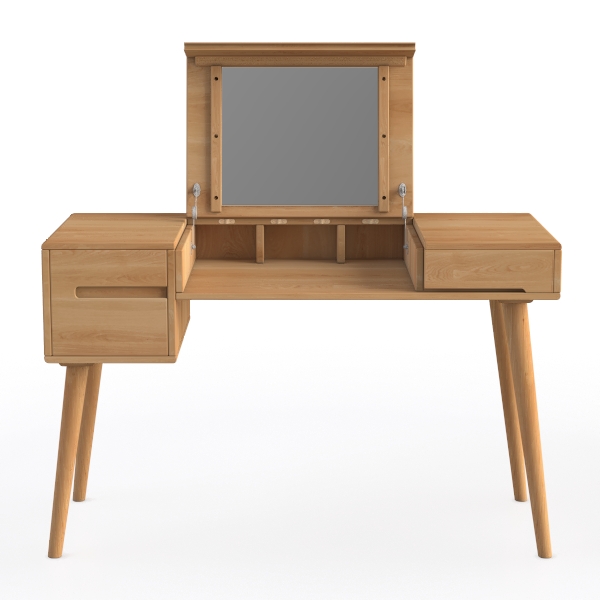 Inspired by natural Scandinavian design, this piece blends warm oak tones and clean lines for a cozy, modern vibe. Its smooth, sanded wood surface offers tactile warmth, while the light hue creates a soft, airy feel. Ideal for a minimalist bedroom, it pairs with linen linens and potted plants, enhancing a serene atmosphere. Two side drawers and a central shelf provide storage, with a hinged mirror adding practicality.