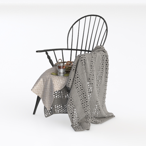 Designed with classic chair silhouettes, this piece blends timeless charm. Its dark wood frame shows natural grain, while the soft white floral-patterned cloth adds gentle texture. A chunky gray knit throw with openwork details drapes loosely, enhancing warmth. Neutral tones create a serene vibe, perfect for a cozy nook in Scandinavian or minimalist living rooms. Comfortable armrests and layered textiles invite relaxation, ideal for quiet afternoons with a book or warm drinks.