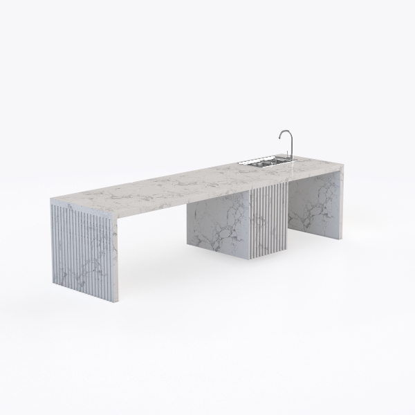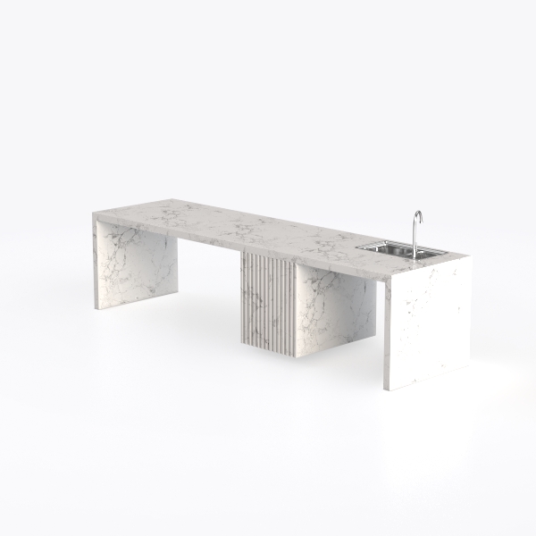 Inspired by natural stone's elegant texture and modern minimalism, this sleek countertop blends purity with clean lines. Its smooth, white marble surface features subtle veining, reflecting light to create a fresh, bright vibe. Perfect for modern-luxe kitchens or bars, pair it with metallic faucets and minimalist cabinets for sophistication. The vertical striped middle section offers hidden storage, balancing style and functionality for daily use.