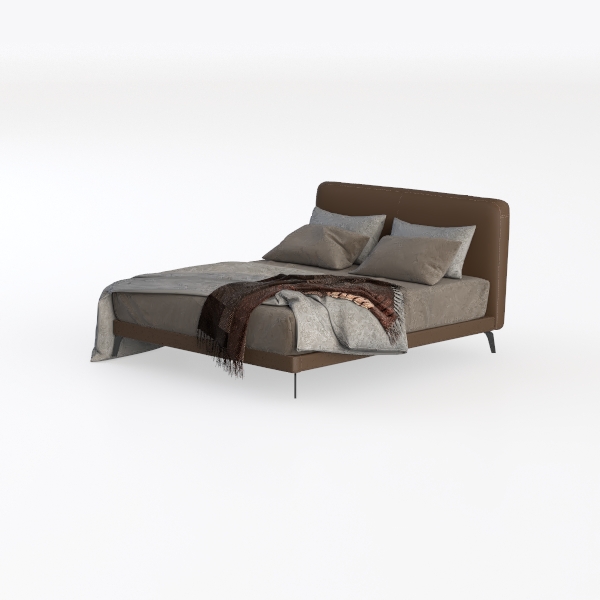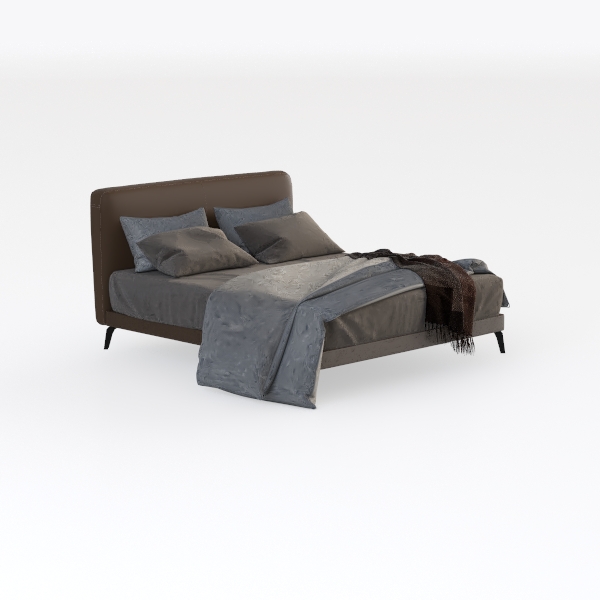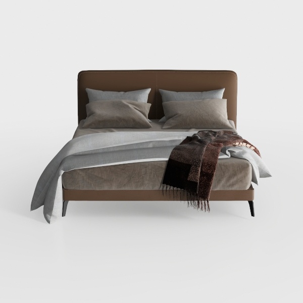 Inspired by organic curves and minimalist Scandinavian design, this bed blends soft lines with warm textures. The textured brown headboard offers a cozy touch, complemented by light gray linen bedding that adds a calm, airy feel. Perfect for a serene, modern bedroom, it pairs beautifully with wooden nightstands and a soft area rug. Sturdy black legs support a plush, supportive frame, ensuring a restful night’s sleep.
