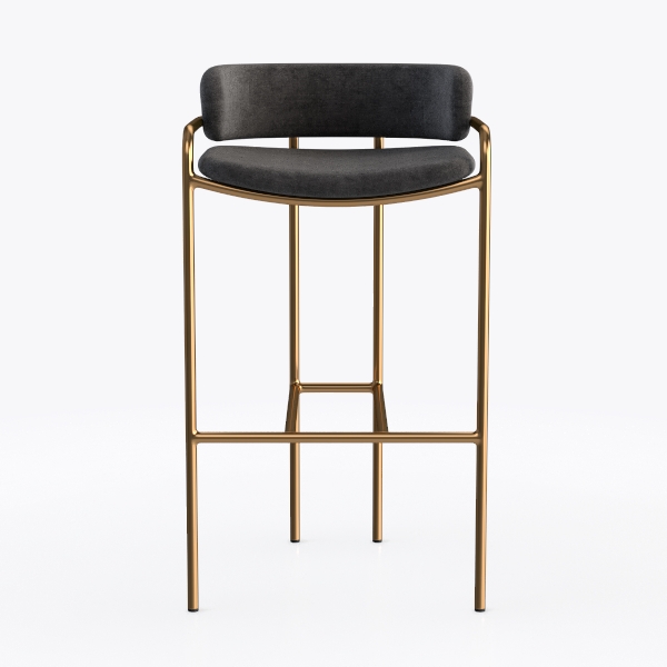 Inspired by mid-century modern minimalism, this bar stool blends warm brass tones with soft charcoal velvet, exuding understated elegance. Its sleek, polished frame and plush seat create a tactile contrast, while the curved backrest offers gentle support. Perfect for a contemporary kitchen island or bar corner, it elevates modern minimalist or mid-century spaces. Sturdy brass legs ensure stability, and the balanced height with soft padding guarantees lasting comfort during casual moments.