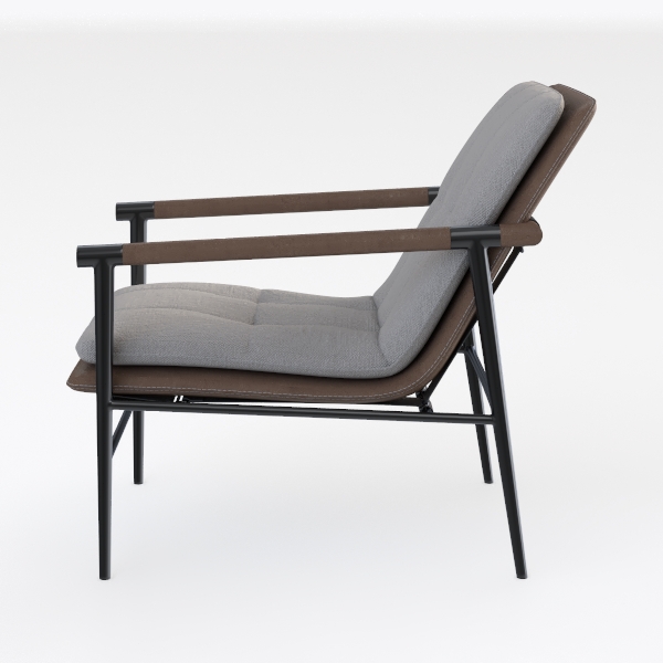 Inspired by mid-century modern design, this lounge chair merges organic curves with clean lines. Soft, textured gray cushion contrasts smoothly with matte brown leather back, framed by sleek black metal. Warm earthy tones and minimalist silhouette suit modern or Scandinavian living rooms, complementing marble coffee tables and metallic lamps. Generous seat depth ensures comfort, slanted backrest offers gentle lumbar support.