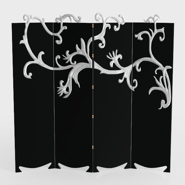 Drawing inspiration from organic vines, this room divider features sleek black panels with delicate white floral carvings. The glossy black surface contrasts vividly with crisp white details, adding striking visual appeal. Intricate, sculptural patterns blend elegance and soft movement, ideal for modern, minimalist, or luxury living spaces. Gold-toned hinges enable flexible movement, defining zones or enhancing room aesthetics.