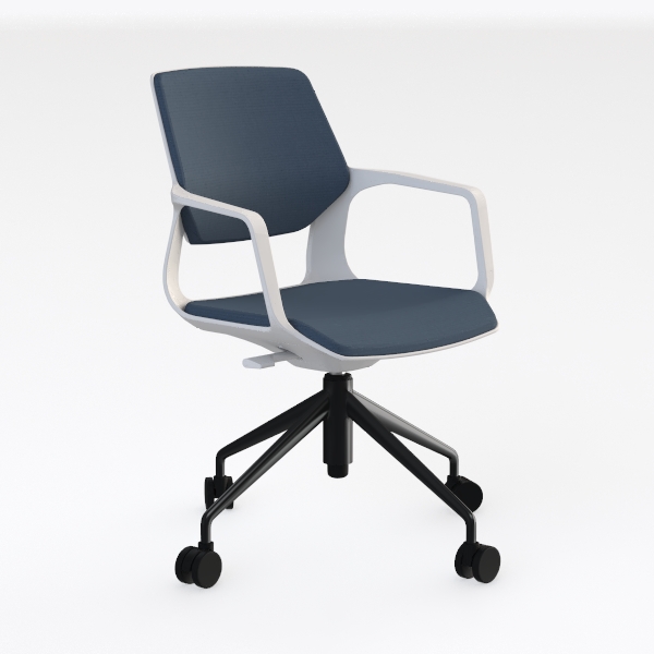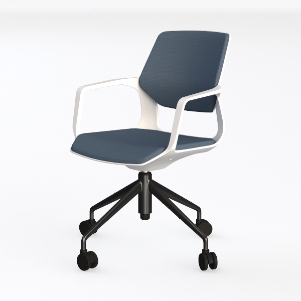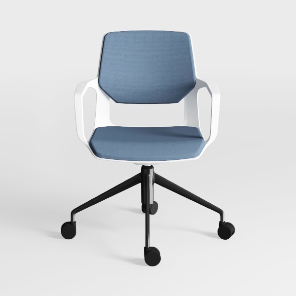 Designed with minimalist ergonomics in mind, this chair features soft blue upholstery offering a comfortable touch, while smooth white armrests and a sleek black five-point base create a clean, modern look. Ideal for home offices or minimalist living rooms, it pairs well with wooden desks and metallic desk lamps. Swivel casters ensure easy movement, and contoured armrests provide extra support during long work hours.