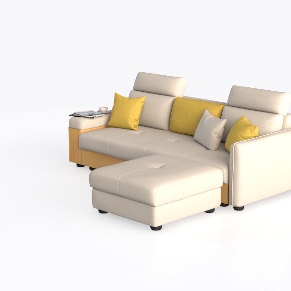 Designed to blend modern simplicity with everyday comfort, this L-shaped sofa draws inspiration from the balance of urban functionality and organic warmth, making it a versatile centerpiece for contemporary living spaces. The light gray upholstery, crafted from a soft, textured fabric, feels surprisingly plush to the touch, with a subtle weave that adds depth without overwhelming the eye. Warm wooden armrests, finished in a natural oak tone, complement the neutral palette, while two vibrant yellow cushions and one muted gray pillow introduce a playful yet intentional contrast, infusing the space with a cozy, inviting energy.