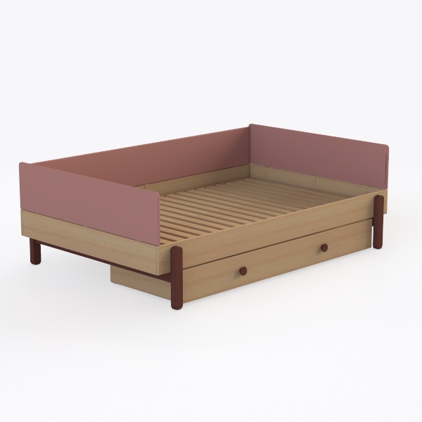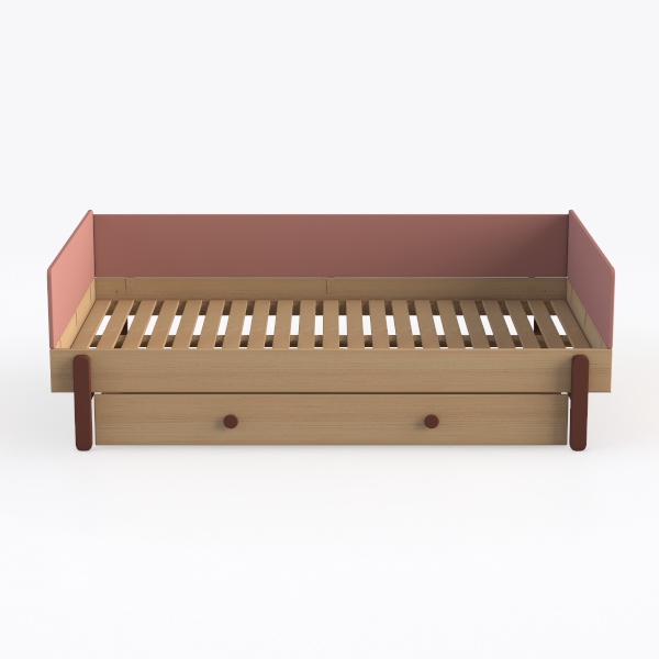 Inspired by soft childhood warmth, this bed blends natural wood slats with a soft pink headboard. Smooth, warm textures and clean lines create a cozy, uncluttered look. Ideal for minimalist kids' rooms or soft modern bedrooms, pairing well with pastel rugs and wooden nightstands. A handy under-bed drawer adds practical storage, keeping spaces tidy while enhancing the gentle, inviting vibe.