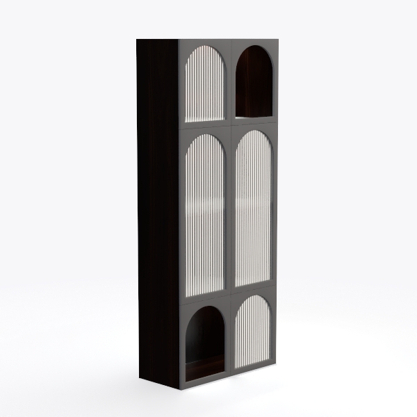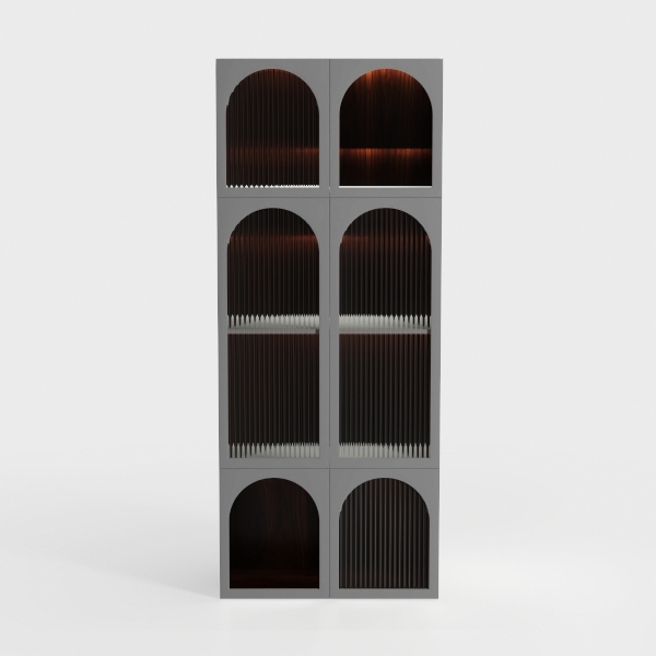 Inspired by architectural archways, this cabinet blends classical charm with modern utility. Crafted from matte gray frames and rich, dark interiors, vertical slats add texture while warm internal lighting casts a cozy glow. Perfect for modern or minimalist spaces, it pairs beautifully with wooden furniture and metallic accents, offering flexible storage for books, decor, or collectibles.