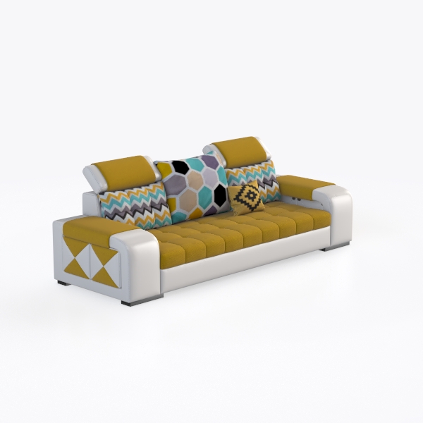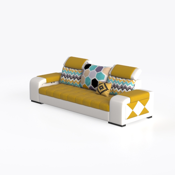 Inspired by the blend of modern minimalism and playful warmth, this sofa embodies a design philosophy centered on creating a space that feels both inviting and visually engaging. The main upholstery features a rich, sunlit yellow fabric with a soft, velvety texture—its plush surface promising a cozy nest for relaxation—while the crisp white armrests and base add a clean, contemporary edge, creating a striking contrast that brightens any room.
