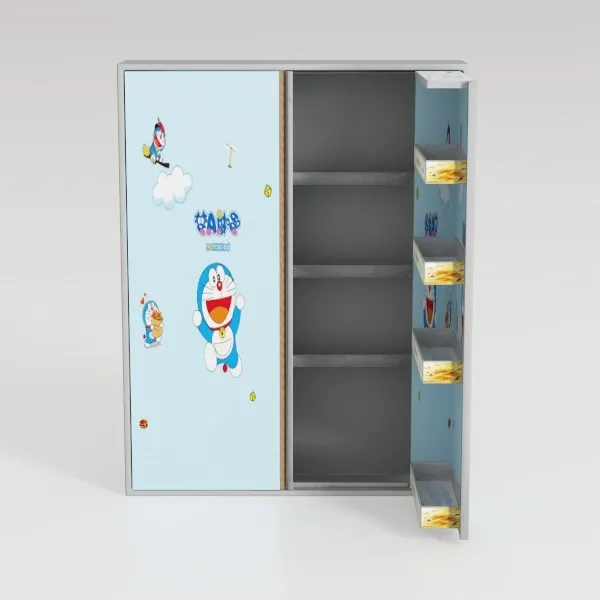 Designed with playful cartoon motifs, this storage unit draws inspiration from beloved childhood characters, blending charm with functionality. Its smooth light blue surface, adorned with cheerful Doraemon prints and cloud motifs, radiates a vibrant, child-friendly vibe. Ideal for a kids' room, it pairs well with soft textiles and pastel decor, enhancing a warm, whimsical atmosphere. Spacious shelves and practical drawers provide ample storage, keeping toys, books, or essentials organized and within reach.