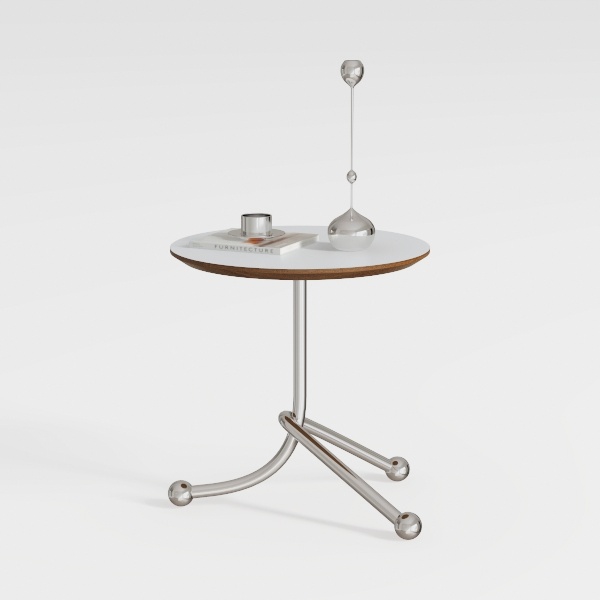 Drawing inspiration from mid-century modern minimalism, this piece features a smooth white top contrasting with warm wooden edges. Sleek metallic legs form a delicate tripod base, adding a cool, airy vibe to any space. Ideal for a modern living room or bedroom, it pairs beautifully with marble accents and soft textiles, while its sturdy structure holds drinks, books, or small decor effortlessly.