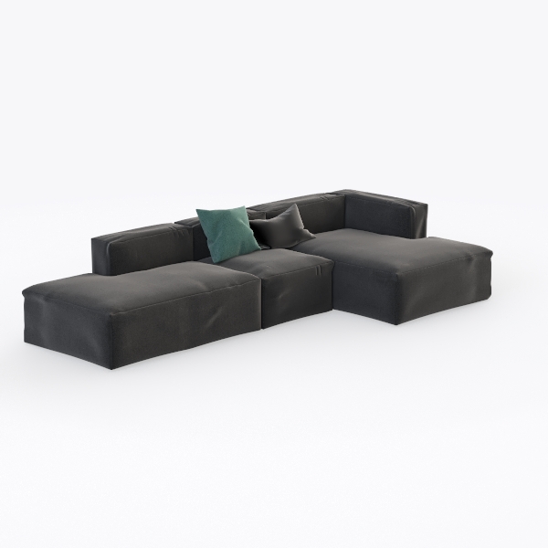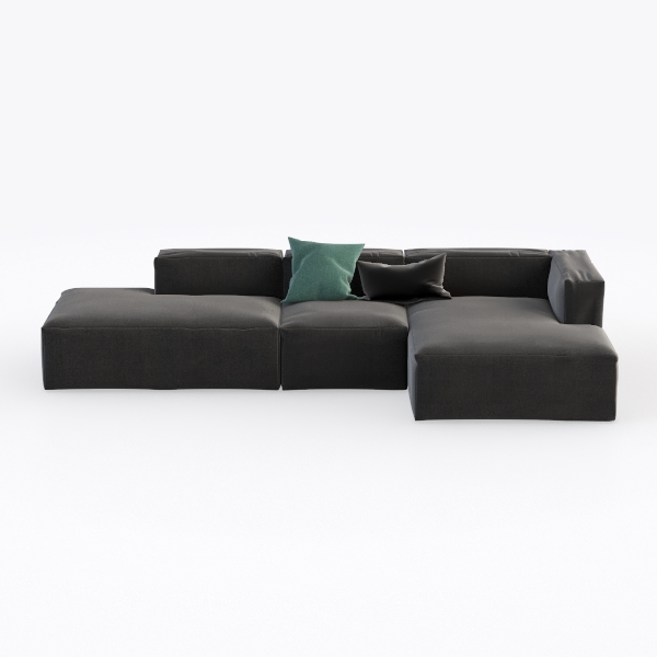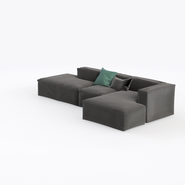 Rooted in the fusion of architectural simplicity and organic comfort, this piece embodies modern design philosophy, merging bold form with everyday usability. The sofa’s deep, muted charcoal fabric feels surprisingly soft to the touch—plush yet structured, with subtle texture that catches light gently without overwhelming the eye. Its modular L-shape, with interconnected sections and angular armrests, creates a balanced silhouette that feels both intentional and uncluttered, making it a quiet centerpiece in any space.