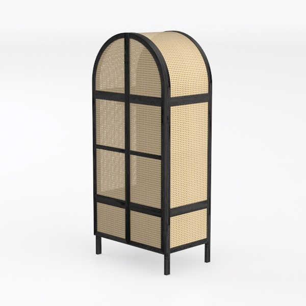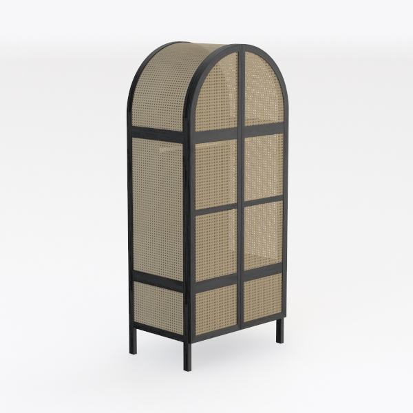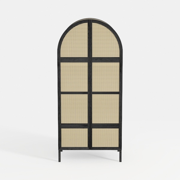 63" Tall Arched Cabinet with Glass Doors & 2 Rattan Drawers, 5-Tier Storage Cabinet for Living Room, Dining Room & Kitchen, Black
