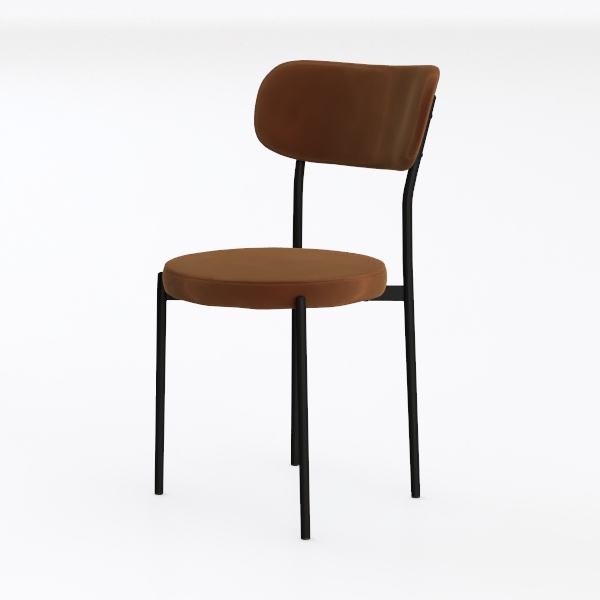 Designed with organic softness and sleek minimalism, this chair draws inspiration from natural curves and modern simplicity. Its warm brown upholstery, with a plush, velvety texture, feels gentle to the touch, while the matte finish adds depth to its visual charm. Ideal for a modern dining room or cozy living nook, it pairs beautifully with wooden tables or metal accents, blending warmth and sophistication. A contoured backrest and sturdy black metal legs ensure comfort during long meals, balancing style with practical support.
