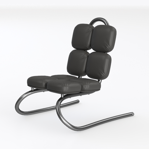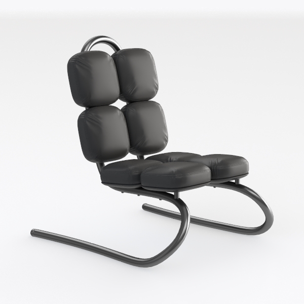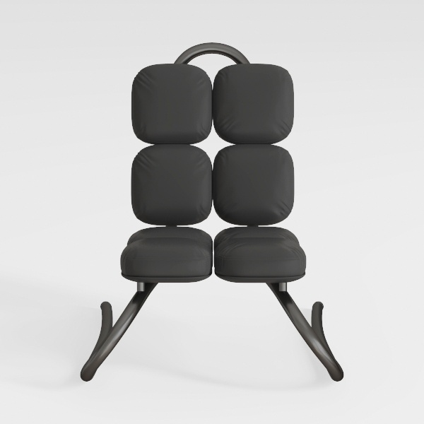 Inspired by geometric minimalism, this chair combines smooth matte black upholstery with four square back cushions and two plush seat pads. Sleek metal legs curve subtly, enhancing its modern aesthetic. Its clean lines and lightweight design suit modern minimalist or industrial spaces, ideal for living rooms or home offices, pairing with wooden tables and bold decor.