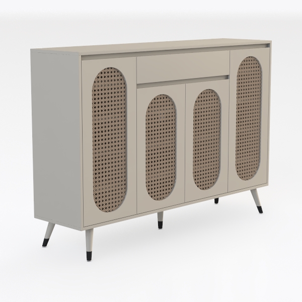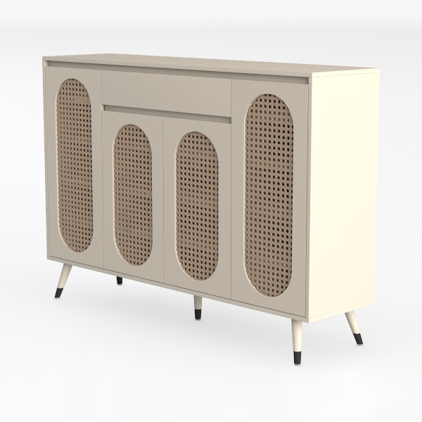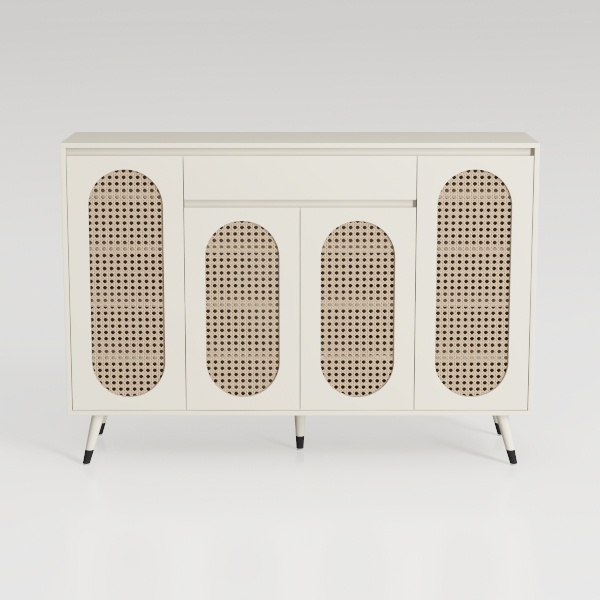 Inspired by natural weaving and mid-century charm, this piece blends rustic texture with modern simplicity. Smooth white surfaces contrast beautifully with intricate woven panels, offering a warm, tactile feel and a light, airy visual appeal. Ideal for a minimalist or bohemian living room, it pairs effortlessly with wooden coffee tables and soft linen decor. With a central drawer and four cabinet doors, it provides ample storage to keep spaces organized and stylish.
