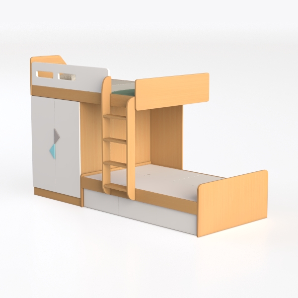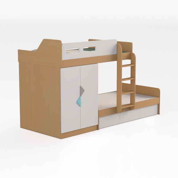Designed to maximize space, this multi-functional bunk bed draws inspiration from modern compact living. Warm wood tones and sleek white surfaces create a calm, airy feel, with smooth, polished finishes enhancing the tactile experience. Perfect for a cozy kids' room or small family space, it pairs beautifully with soft pastels and playful decor. Equipped with a lower full bed, upper twin bed, integrated wardrobe, and under-bed storage drawers, blending practicality with timeless style.