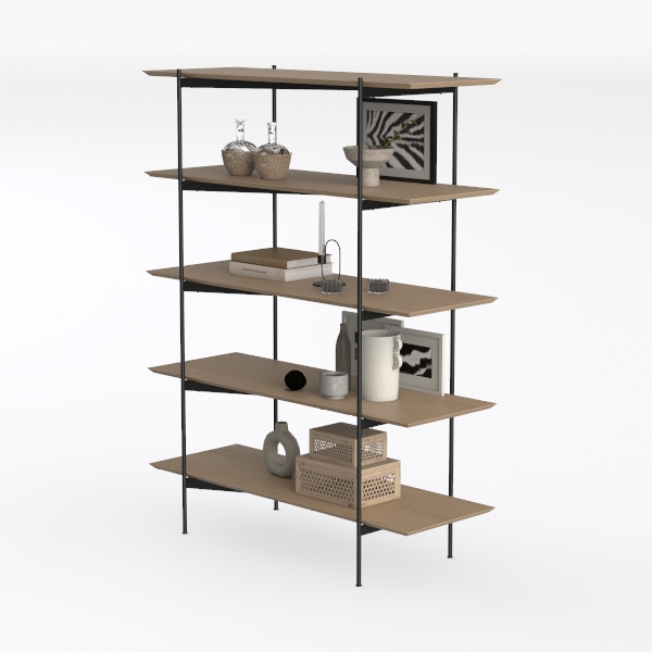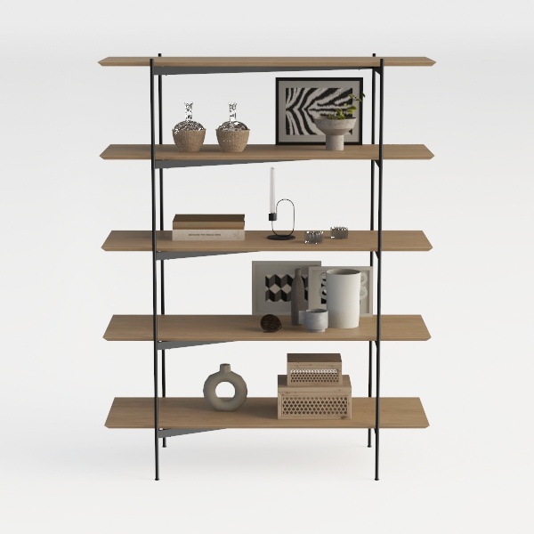 Rooted in blending natural warmth with geometric precision, this shelving unit features light wooden shelves with a matte finish and sleek black metal frames, creating a balanced, airy feel. Its staggered design offers flexible storage, while sturdy legs ensure stability, making it perfect for modern living rooms or studies—pair with potted plants, geometric art, and ceramic decor to enhance minimalist or industrial aesthetics.