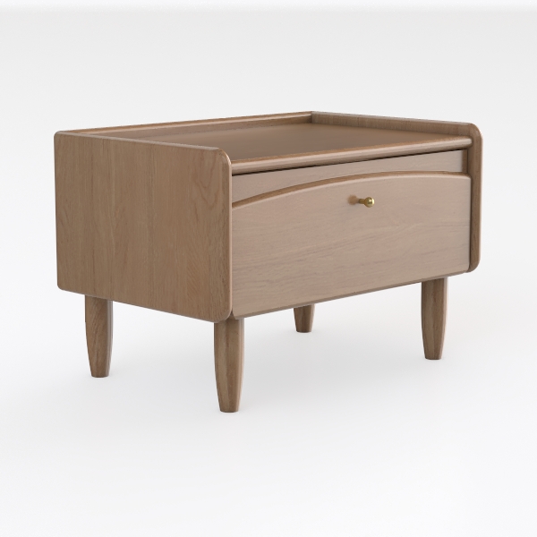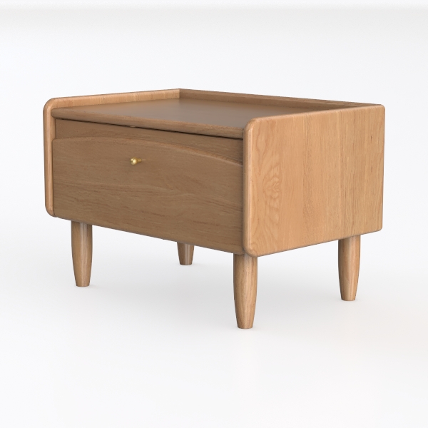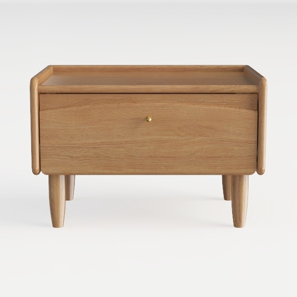 Inspired by Scandinavian minimalism, this piece merges soft natural curves with practicality. The warm oak finish showcases rich, visible wood grain, offering a smooth, tactile feel that adds gentle warmth. Ideal for modern or Japanese-style bedrooms, it pairs with linen bedding and a marble side table. A single drawer delivers ample storage for small items, while slim, tapering legs keep the look light and airy.