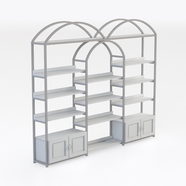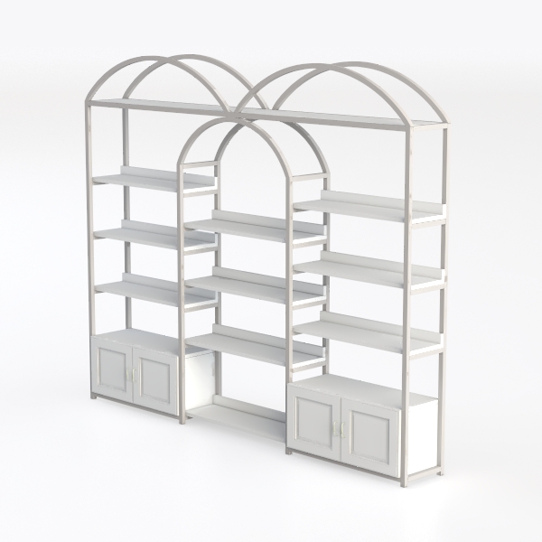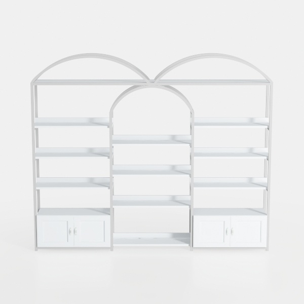Inspired by architectural arches, this white shelving unit features sleek lines and a smooth surface, blending open and closed storage. Its clean, minimalist design complements modern or Scandinavian spaces, ideal for displaying decor and organizing essentials when paired with wooden accents and soft lighting.