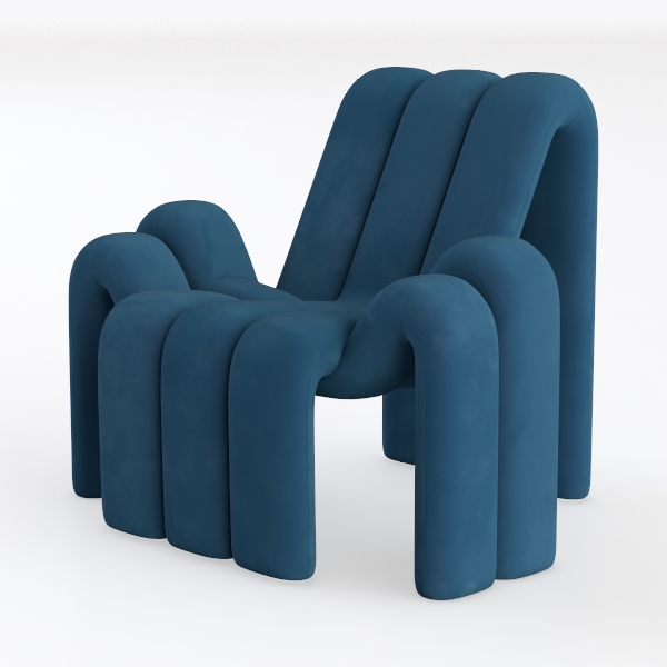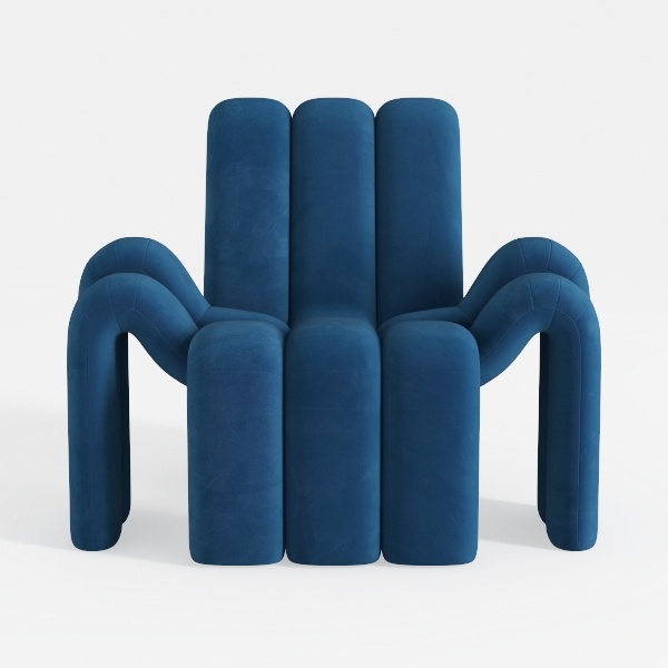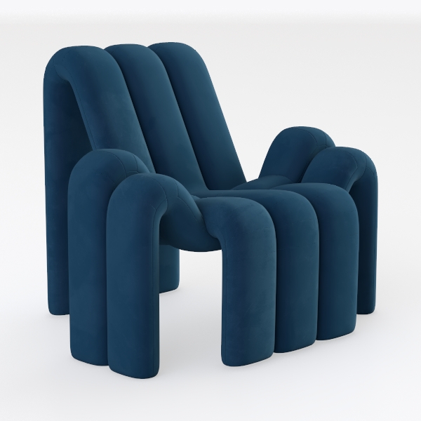 Inspired by organic fluidity and sculptural art, this armchair features flowing, curved forms. Its deep indigo velvet surface offers a soft, sumptuous, velvety touch, creating striking visual depth. Perfect for modern or mid-century modern spaces, it pairs with minimalist coffee tables and metallic accents, enhancing sophisticated coziness. Generous, curved armrests and plush padding ensure exceptional comfort for extended relaxation.