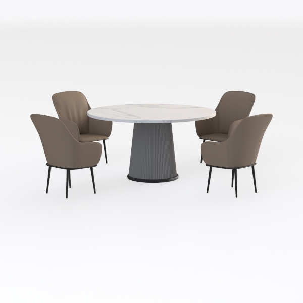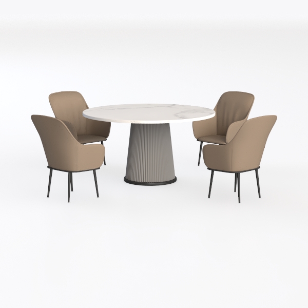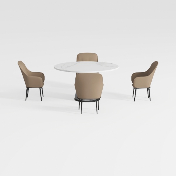 Inspired by natural marble's organic veining and minimalist geometric forms, this dining set blends elegance with functionality. The marble top feels smooth and cool, while soft beige upholstery adds warmth. Clean lines and balanced proportions suit modern minimalist dining spaces, pairing beautifully with wooden walls or metallic accents. Generous table diameter fits gatherings, and curved chair backrests offer great lumbar support for comfortable meals.