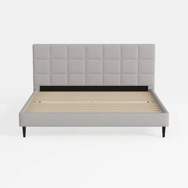 The headboard, a standout feature, is crafted with a soft, textured upholstery in a muted light gray tone, inviting gentle touches and adding subtle depth to the space. Its paneled, grid-like pattern breaks up the surface without overwhelming, while the smooth, slightly raised edges enhance its polished look. Below, the frame transitions to a sleek, solid wooden slat base—light in color and grain, it radiates a natural, earthy warmth that complements the headboard’s softness. The slim, black legs elevate the frame, creating a sense of airiness and allowing the bed to blend seamlessly into any modern or Scandinavian-inspired bedroom.