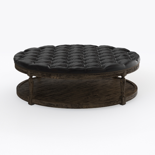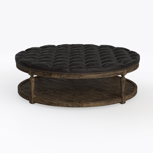 Inspired by classic 19th-century craftsmanship, this round coffee table blends a soft, tufted leather top with warm, weathered wood. Carved legs add intricate texture, while the lower shelf offers hidden storage. Smooth to touch and exuding timeless elegance, it pairs beautifully with vintage armchairs and marble side tables, enhancing warmth and sophistication in a cozy living room.
