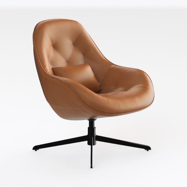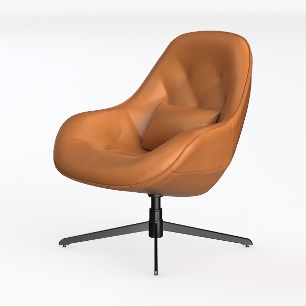 Inspired by mid-century modern design with a contemporary twist, this armchair features soft, velvety orange upholstery. Its plump, tufted backrest and curved, enveloping shape create a warm, inviting look, while a matching pillow adds comfort. The black swivel base allows easy movement, making it ideal for a modern-luxe living room or cozy home office, paired with marble side tables and geometric rugs.