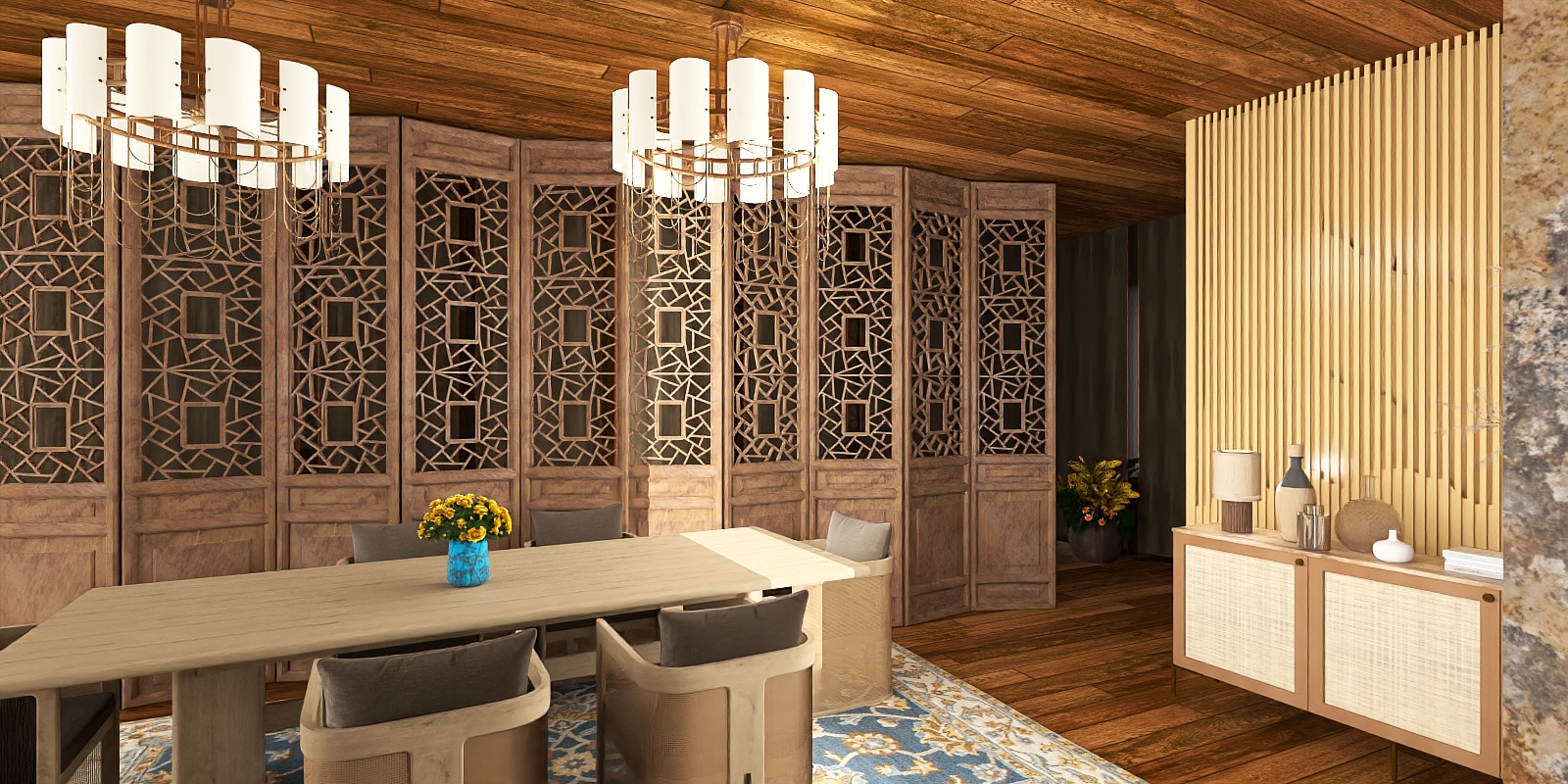 Rooted in traditional Eastern craftsmanship, this wooden room divider showcases warm, textured surfaces with intricate geometric cutouts that cast soft, dappled light. Ideal for new Chinese or minimalist living rooms, it pairs beautifully with linen sofas and celadon decor, dividing spaces while maintaining flow and enhancing depth.