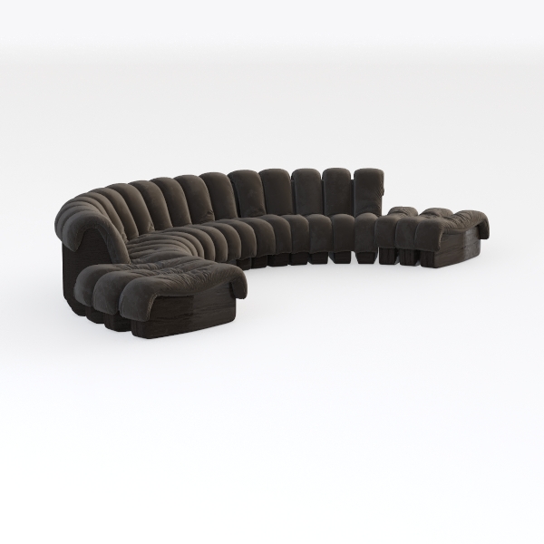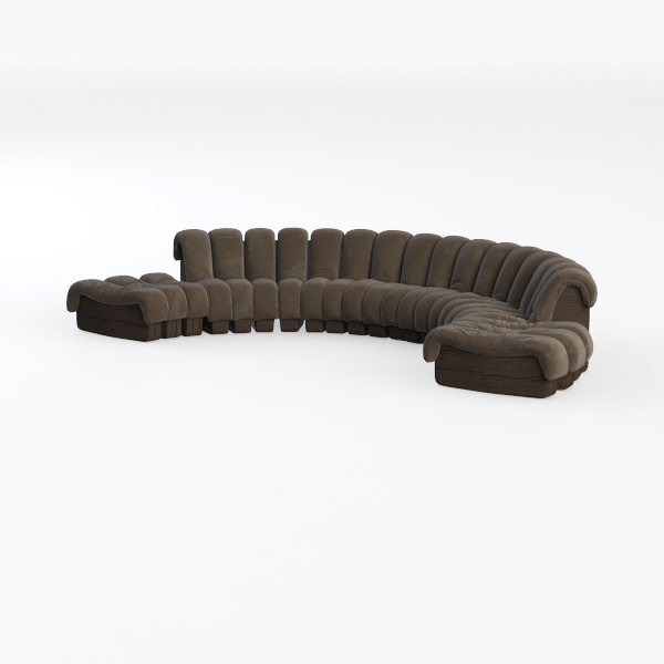 The velvety taupe upholstery wraps around the piece, inviting touch with its plush, buttery texture. Subtle light dances across the fabric’s warm sheen, enhancing the tactile allure, while the continuous arc creates a cohesive, immersive seating space that balances intimacy and openness.