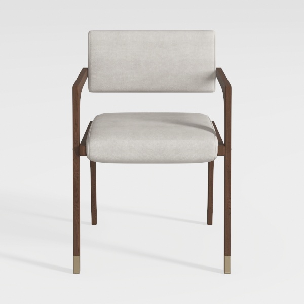 Inspired by mid-century minimalism, this chair blends soft, textured off-white upholstery with warm oak wood frame and sleek brass-tipped legs, creating a mix of comfort and modern elegance. Ideal for a contemporary dining room or minimalist living space, pairing beautifully with marble tables and geometric light fixtures. Its ergonomic backrest and sturdy legs ensure long-lasting comfort, making it both stylish and practical.