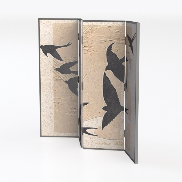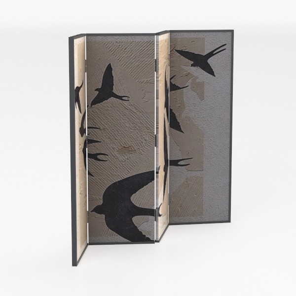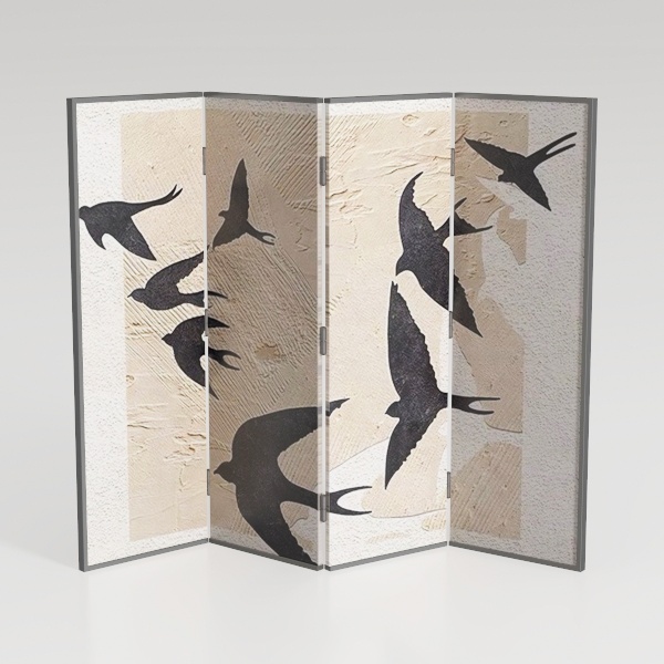 Inspired by the fluidity of birds in flight, this room divider features textured surfaces in soft neutral tones. Its warm, tactile panels with elegant bird silhouettes add a serene, organic touch. Ideal for defining spaces in modern, minimalist, or bohemian settings, pair it with wooden furniture and woven textiles. A versatile piece that blends functionality as a room separator with decorative charm.