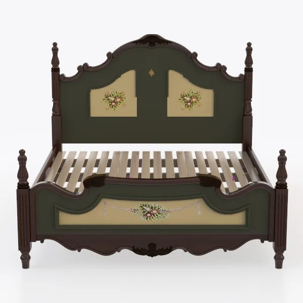 Inspired by classic 19th-century European furniture, this bed features intricate carved wooden frames in deep brown, sage green and cream panels with hand-painted floral motifs. Smooth, textured wood offers a warm touch; elegant curves and floral details create a timeless, cozy vibe. Ideal for a vintage or French country bedroom, pair with lace curtains and wooden nightstands. Sturdy slats ensure stable support, blending beauty and function.