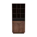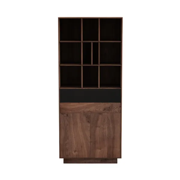 Inspired by mid-century minimalism, blending geometric precision and natural warmth. Rich, dark wood grain offers a warm, smooth touch; a sleek black panel adds modern contrast, highlighting clean lines. Ideal for minimalist home offices or cozy living rooms, pairing beautifully with marble accents and soft lighting. Spacious open shelves display books/decor; the closed cabinet below provides hidden storage, balancing style and utility.